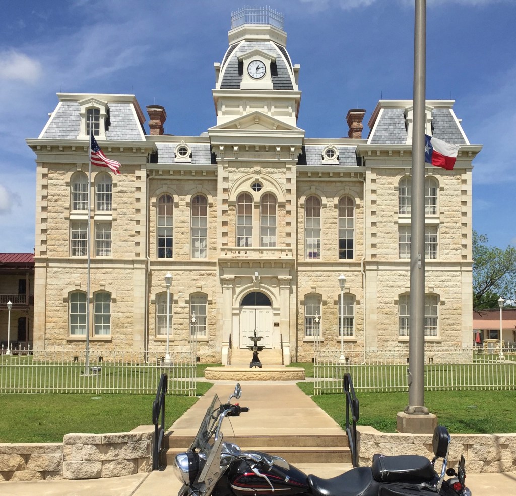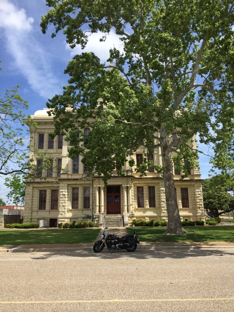 The first photo of my bike in front of a county courthouse was in Cameron, the seat of Milam County. There’s a big sycamore tree obscuring the courthouse in my photo, and I almost immediately regretted not trying to get a better angle. Eventually, I’ll get a better shot. Unfortunately, I’ve had several cases where getting a good photo of a county courthouse from the street is impossible because of the thick foliage of trees. But this is one where I could have done better by just moving to the left a bit.