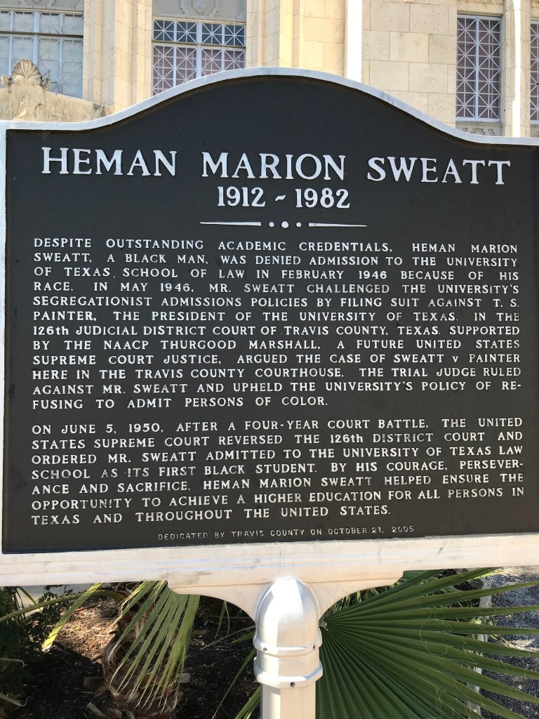“Despite outstanding academic credentials, Heman Marion Sweatt, a black man, was denied admission to the University of Texas School of Law in February 1946 because of his race. In May 1946, Mr. Sweatt challenged the University’s segregationist admissions policies by filing suit against T.S. Painter, the President of the University of Texas, in the 126th Judicial District Court of Travis County, Texas. Supported by the NAACP Thurgood Marshall, a future United States Supreme Court Justice, argued the case of Sweatt v Painter here in the Travis County Courthouse. The trial judge ruled against Mr. Sweatt and upheld the University’s policy of refusing to admit persons of color.