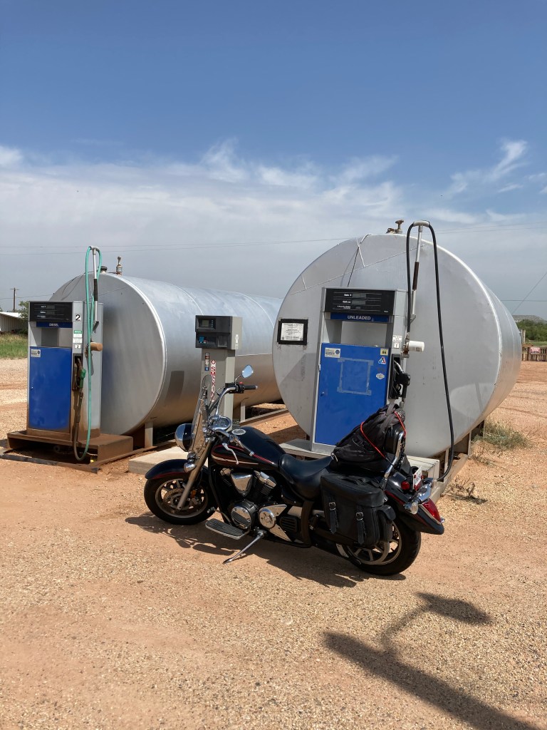 Next stop was Gail (Borden County). I was getting low on fuel, and planning to fill up there. I arrived in Gail and did not see a single filling station. There is an RV park there, and figured I could go knock on some doors and find someone with a spare gallon I could buy. But then I saw someone park outside what appeared to be a small convenience store, so I asked him if he knew of the nearest filling station. He turned and pointed right next door. I had to do a double take, since I didn’t see anything that looked like a gas station. As I moved closer, I found my salvation. Self service, credit card reader, no shade from the sun, but gasoline!